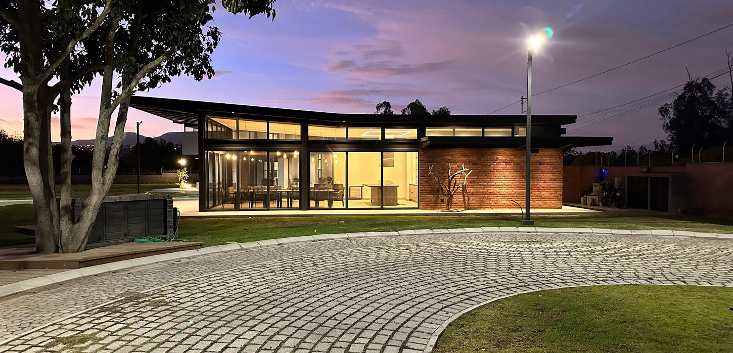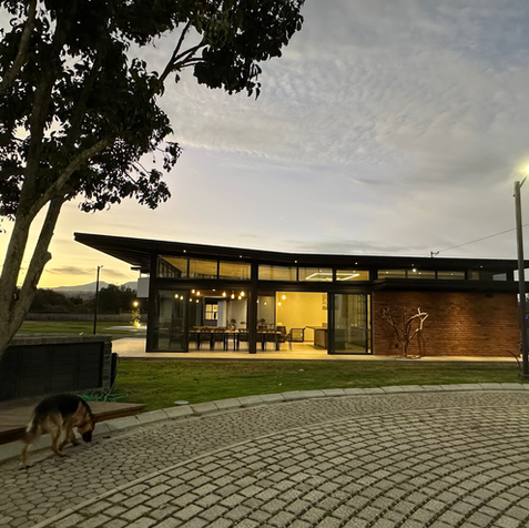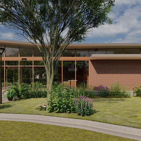 Casa Comunal: los espacios servidores se organizan en volúmenes sólidos de ladrillo, concentrando los recintos de apoyo y liberando la planta para las áreas de uso social. El programa público se resuelve mediante cerramientos acristalados que optimizan la iluminación natural y refuerzan la relación visual con el exterior. La cubierta ascendente orienta la espacialidad hacia los jardines, se abre a ellos y consolida la continuidad interior–exterior.